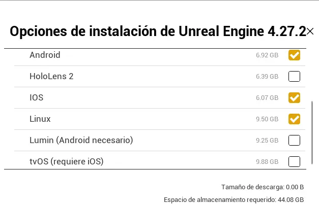Before installation starts, there are those install options and they're optional. Recommended to enable Android, iOS (if you're working on a Mac) and Linux. For VR, HoloLens and Lumin are the tools for that.